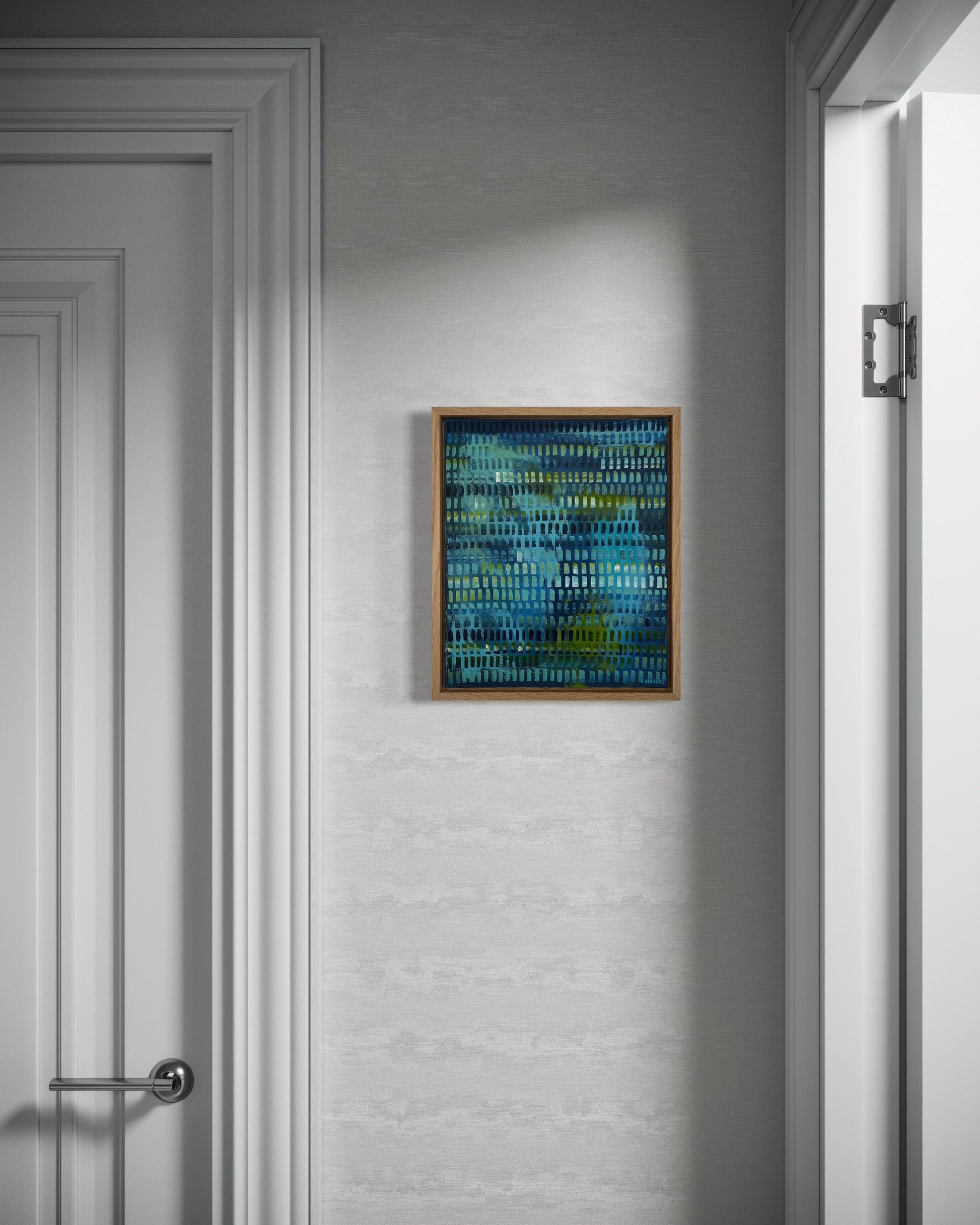 Framed in a premium oak 28mm deep floating frame, with hanging wire attached, ready to hang.