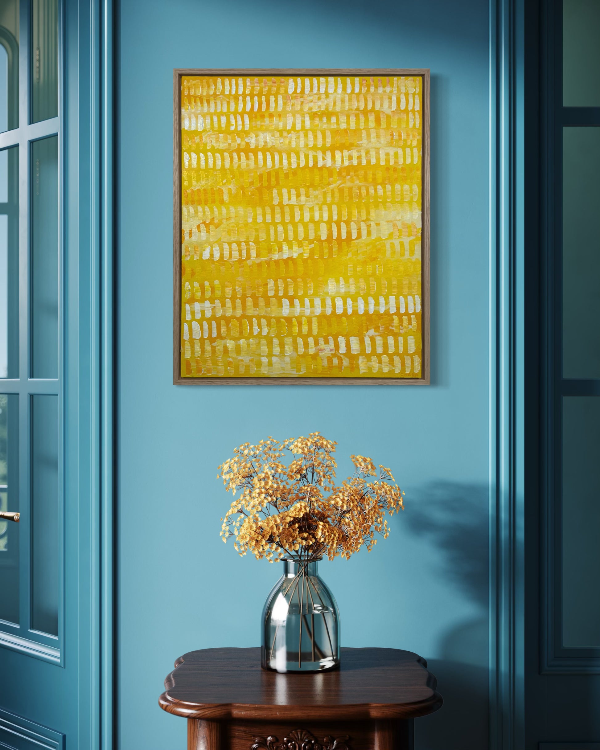 Framed in a premium oak 28mm deep floating frame, with hanging wire attached, ready to hang.