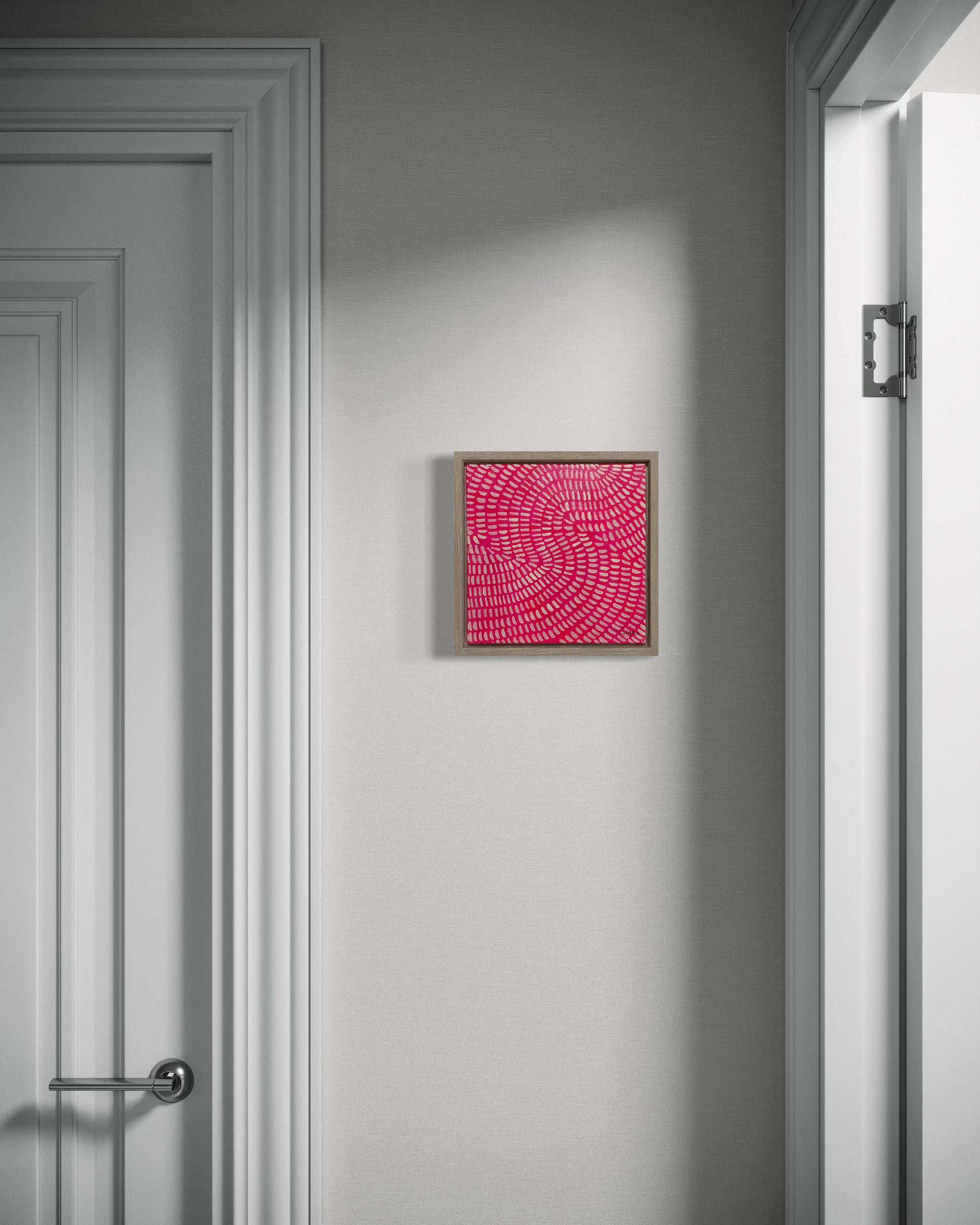 Framed in a premium oak 28mm deep floating frame, with hanging wire attached, ready to hang.